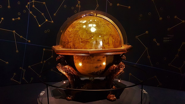 “L’exposition débute avec trois magnifiques instruments et œuvres d’art du XVIIe siècle : un globe céleste, un globe terrestre et une sphère armillaire qui est un modèle plaçant la Terre au centre de l’univers.