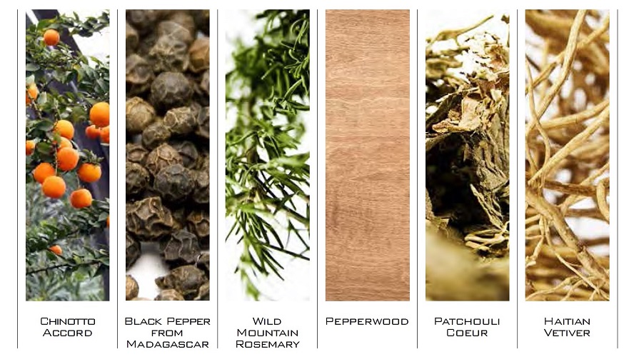A travers une vague olfactive aux facettes poivrées, géraniums et roses, on atteint les notes de fond où des bois précieux comme le cèdre du Texas, le patchouli cœur, le vétiver haïtien, l’accord mousse de chêne de montagne et le bois de santal se fondent subtilement pour créer une rondeur douce et sensuelle avec la fève Tonka qui se mêle parfaitement à la vanille.
